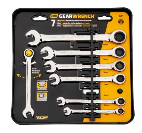The GearWrench 7‑Piece Metric Ratcheting Wrench Set is a compact, high-performance tool kit designed for metric fasteners. It features a 72-tooth ratcheting box end that allows just a 5° swing to turn a fastener—compared to about 30° for standard wrenches—making tight spots much easier to handle. Reg. $169.99