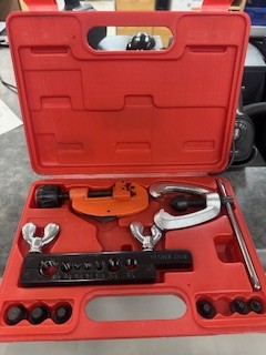 professional-grade kit for creating accurate double and single flares on steel, copper, aluminum, and brass tubing. It includes seven dies (3/16″–5/8″), a heat-treated yoke, handle, bar assembly, and a built-in tube cutter, all stored in a durable case. Reg. $139.99